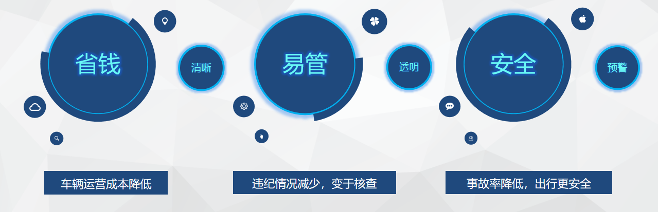 特色功能:单车追踪、电子围栏、报警统计、预约出车、油耗分析、里程统计、可视化数据大屏。