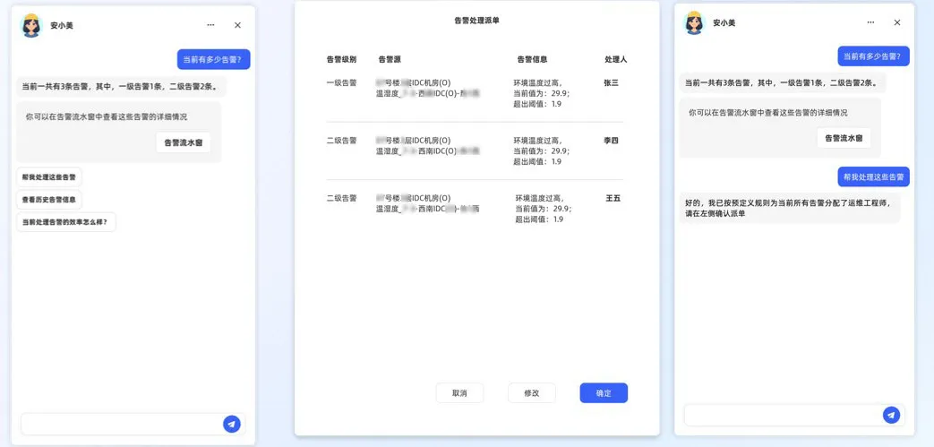 龙翼基于安美研发的AI数字员工安小美通过自然语言交互,可实现告警信息一键答复,它能直接回答你关于数据中心历史告警、当前告警、告警工单等信息,通过其内在的RPA(流程自动化)机器人,实流程自动化,保障关键信息7*24小时无错漏的到达关键的人员,提升人员分工管理的效率。